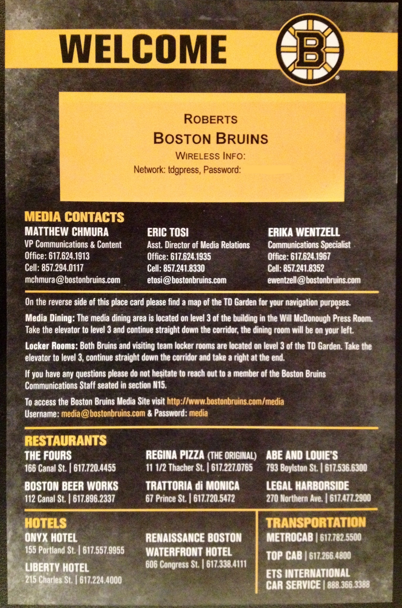 To start my experience, I bought a new Bruins cap at the Pro Shop. I came back down to where I had entered to wait for Bruins Communications Specialist Erika Wentzell. Erika gave me a tour of the media areas of the TD Garden. Once I introduced myself and received my very own press pass, we got right in on the tour.
