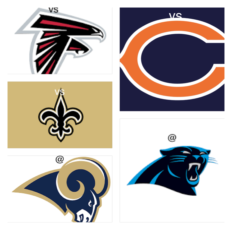 This will be a tough schedule to overcome. It includes two meetings with the 11-0 Panthers, an easier home game vs the Saints, and semi-tough games in Tampa Bay and Jacksonville. They may be able to defeat the Panthers at home, but doing it in Carolina will be hard. With the way this team is struggling, I get Tampa and the Jags will beat them, while they beat the Saints, and maybe Carolina if they’re lucky.