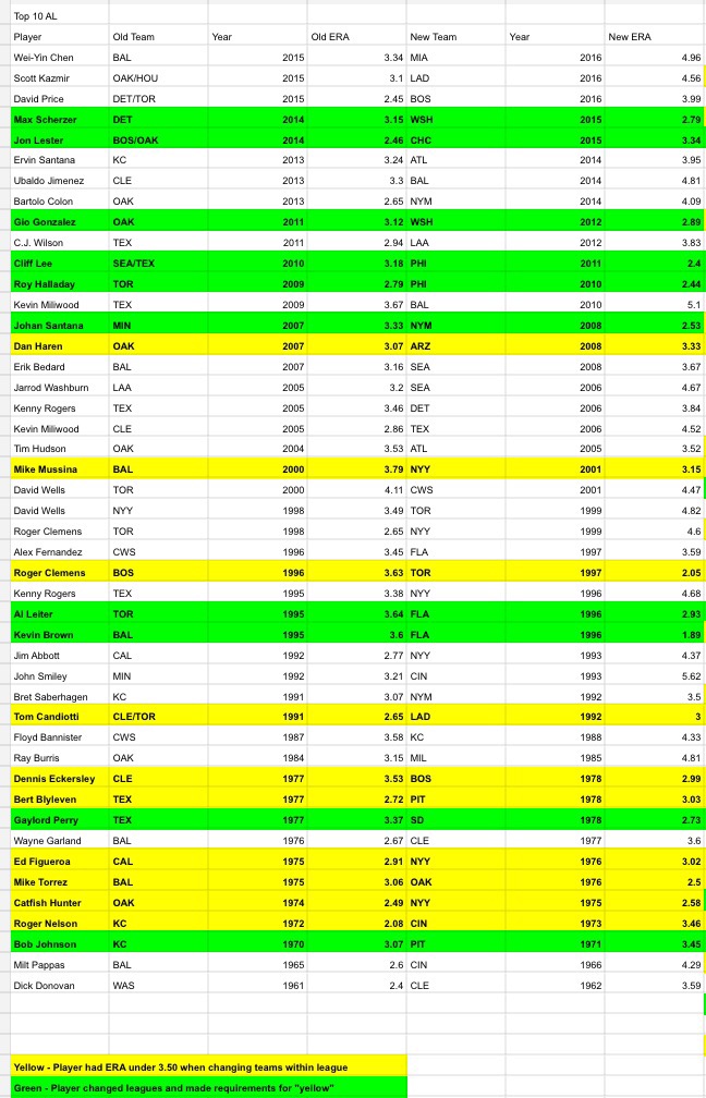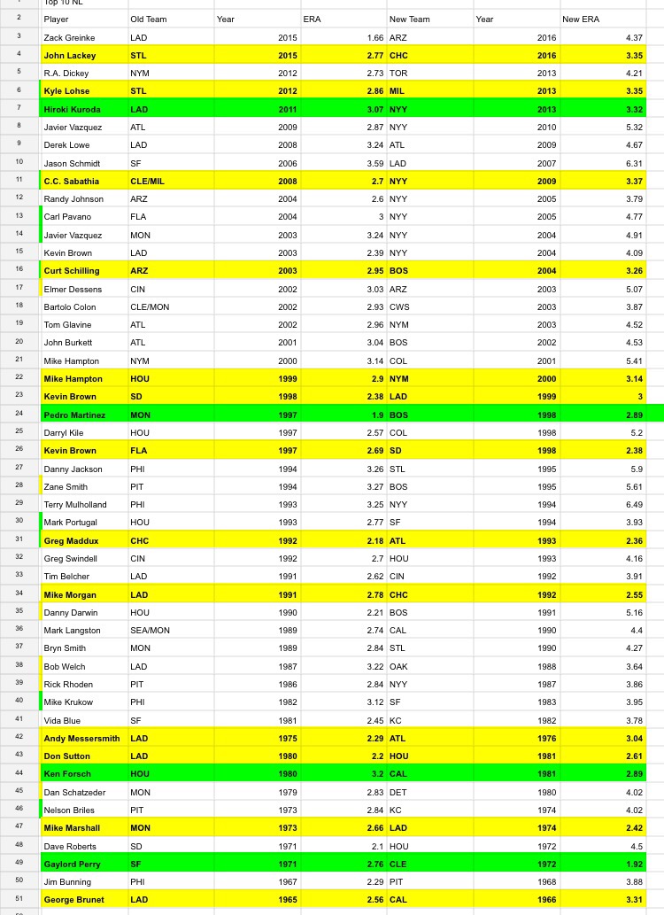 - 95 Pitchers who were in the top 10 in ERA for the AL or NL switched teams the following year. Of those 95, only 17 (13 AL, 4 NL), improved their ERA. That’s 17.9%! 1 of them did not have an ERA under 3.50 in either year (Tim Hudson, 3.53 Year 1, 3.52 Year 2).