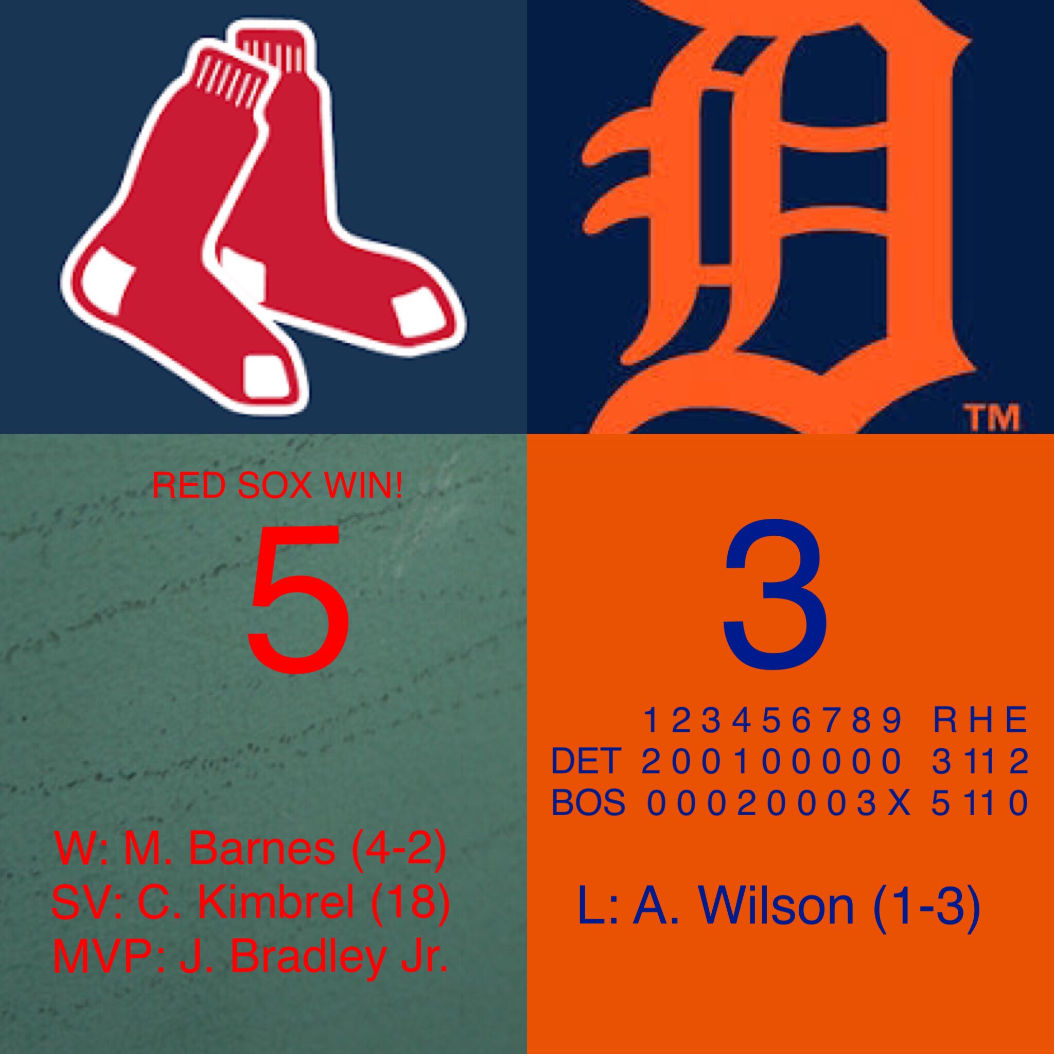 The Red Sox went on to top the Tigers 5-3. Each team got 11 hits in this big hitting game. Mitch Moreland went 3-4 with 2 RBI, JBJ went 2-4 with another 3 RBI. Lots of good plays by JBJ and Mookie Betts made the game interesting and I was at the game and witnessed the great comeback victory.