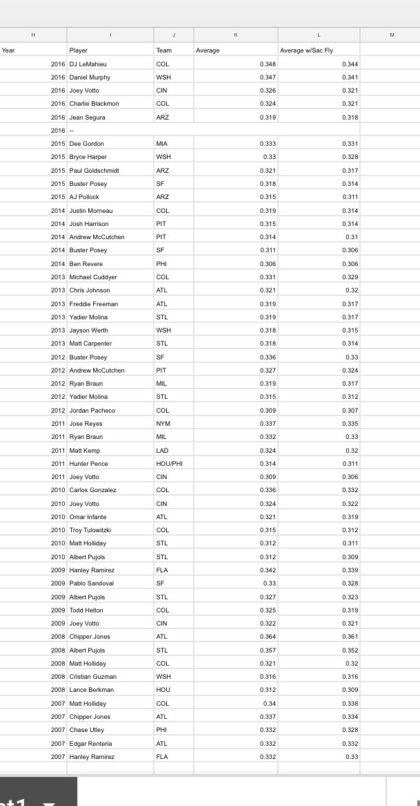 Did you know that if the current sacrifice fly rule were in effect in 1941, Ted Williams would’ve batted .417? Instead, Williams batted .406 becoming the last player to bat over .400. I have recalculated the top 5 batting averages in each league from the last 10 years if the current sacrifice fly rule wasn’t in effect.