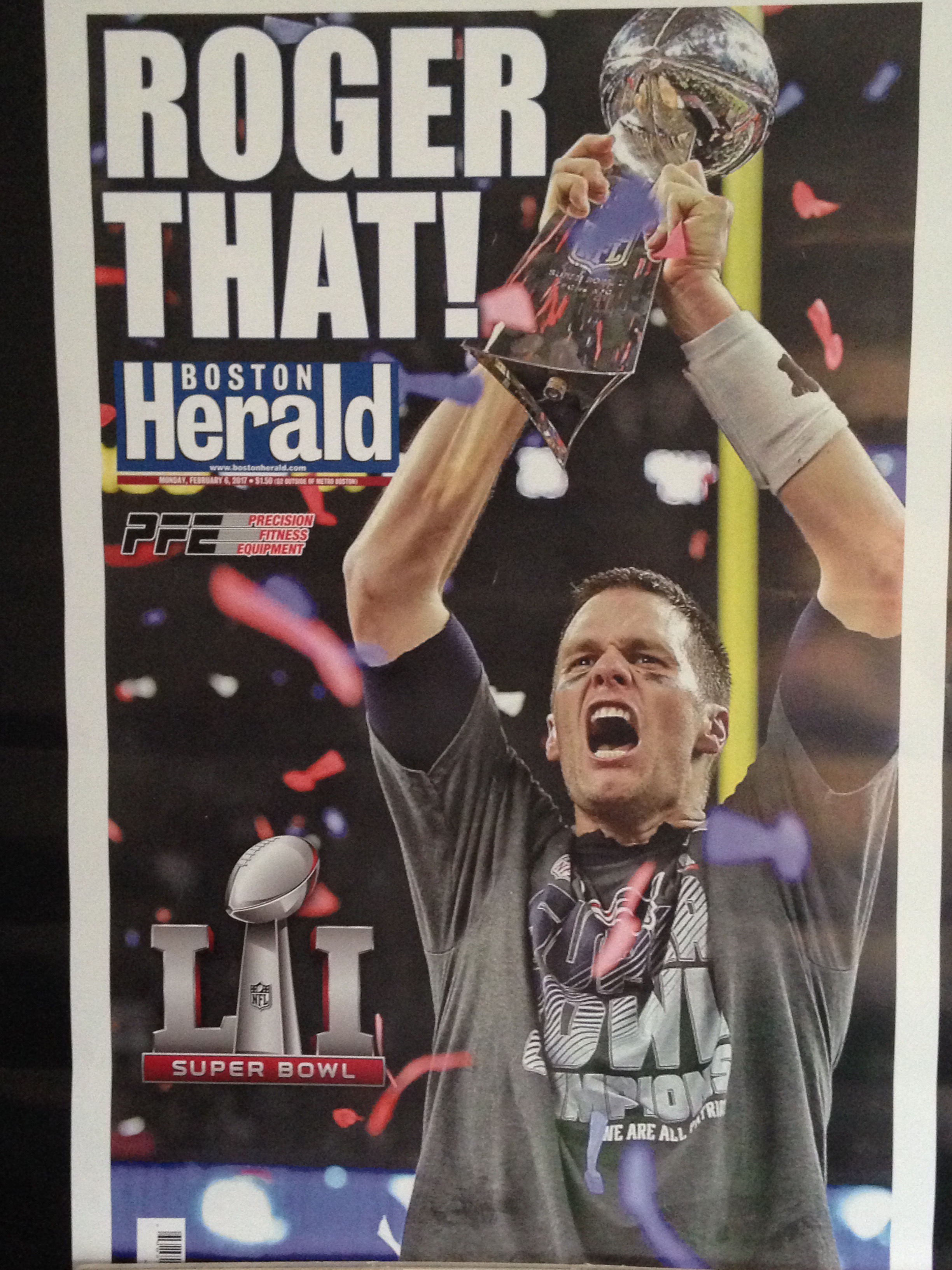 When I came in the next day, I saw the article I presented on the cover as I read the paper. As a gift, they gave me a poster of the Herald’s front cover from the day after Super Bowl 51. The headline was “Roger That” with a picture of Tom Brady holding the Lombardi trophy.