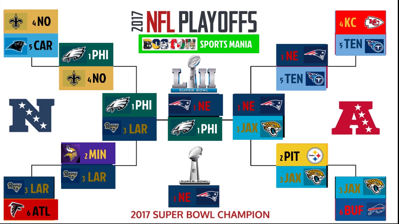 I have the Patriots topping the Philadelphia Eagles in Super Bowl LII. A lot of people have said the Vikings will make the Super Bowl in their home stadium. If they did that, they would be practically invincible. But I think RB Todd Gurley will lead the Rams past them in Minnesota, and the Rams will fall short in Philly, allowing Philly to advance to Super Bowl LII, losing to New England.