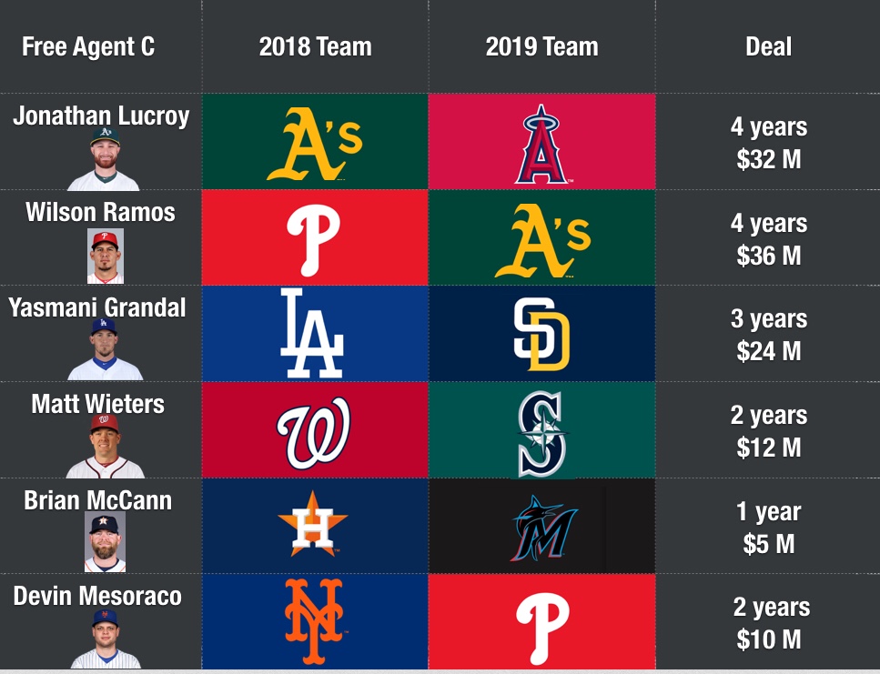 The Nationals signed C Kurt Suzuki this week, and the Mariners dealt off C Mike Zunino to Tampa Bay. That should cause the catcher market to keep moving quickly. The Angels need a catcher upgrade desperately. They will be in the market for top options Wilson Ramos and Jonathan Lucroy. The A’s will also look for a catcher after losing Lucroy. I could see them adding Ramos. I have Grandal returning to the Padres, where his career started. He will split time with C Austin Hedges. Wieters will head to Seattle. The Mariners are looking for a cheap option at catcher to support C David Freitas. I have the Marlins signing McCann after trading C J.T. Realmuto (I think he’s going to either Atlanta or Milwaukee). That leaves Devin Mesoraco, who will sign with the Phillies and split time with C Jorge Alfaro. The Mets will miss out in the catcher market and stick with Travis d’Arnaud at catcher.