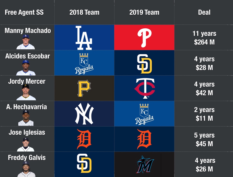 Whoever signs Machado will need to offer a lot, and the Phillies have enough to sign Machado with money to spare for Mike Trout or another big free agent in a couple years. The Phillies are ready to make the jump to contention, and Machado plus some cheaper free agents might be enough to do it. The Twins will add Mercer to support Dozier, and Alcides Escobar will go to the Padres, who will seek veterans as insurance for their younger players. That leaves guys like Adeiny Hechavarria, Jose Iglesias, and Freddy Galvis for rebuilding teams. I have the Royals adding Hechavarria as another infield option, the Tigers reuniting with Iglesias, and the Marlins adding Galvis to support the young J.T. Riddle.