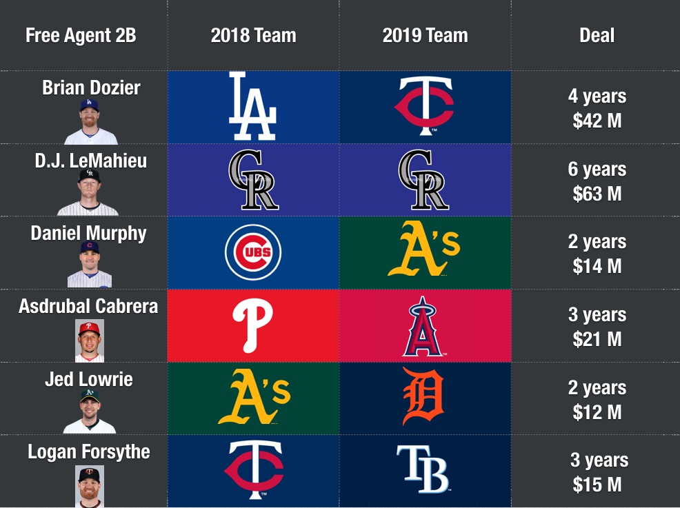 The Twins are in it to win it, and reuniting with Dozier after a deadline deal will help fill one of their biggest holes: middle infield. They may need a shortstop next to Dozier. I also have LeMahieu returning to Colorado. If the Rockies part ways with LeMahieu, they may have a hard time finding a replacement. They definitely need a second baseman, and LeMahieu is the best fit. I have Murphy heading to the A’s, who will be able to afford him. It was a down year for Murphy, and it could make for a bargain signing for a small market team with a hole at second like Oakland. That leaves Asdrubal Cabrera, Jed Lowrie, and Logan Forsythe as the top 2B options remaining. The Angels will sign Cabrera as an upgrade over Ian Kinsler. Lowrie and Forsythe could be afforded by rebuilding/small market teams like the Tigers and Rays. The Tigers desperately need middle infield help. They will look for bargains as they find their free agents.