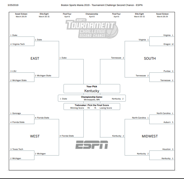 But luckily, ESPN has allowed everyone a second chance bracket. I did not have many upsets on my bracket, but there haven’t been many yet, so I don’t want to overdo it in these later rounds, especially because there’s only two teams left that don’t own a Top 4 seed in their region. Here is my Second Chance bracket below: