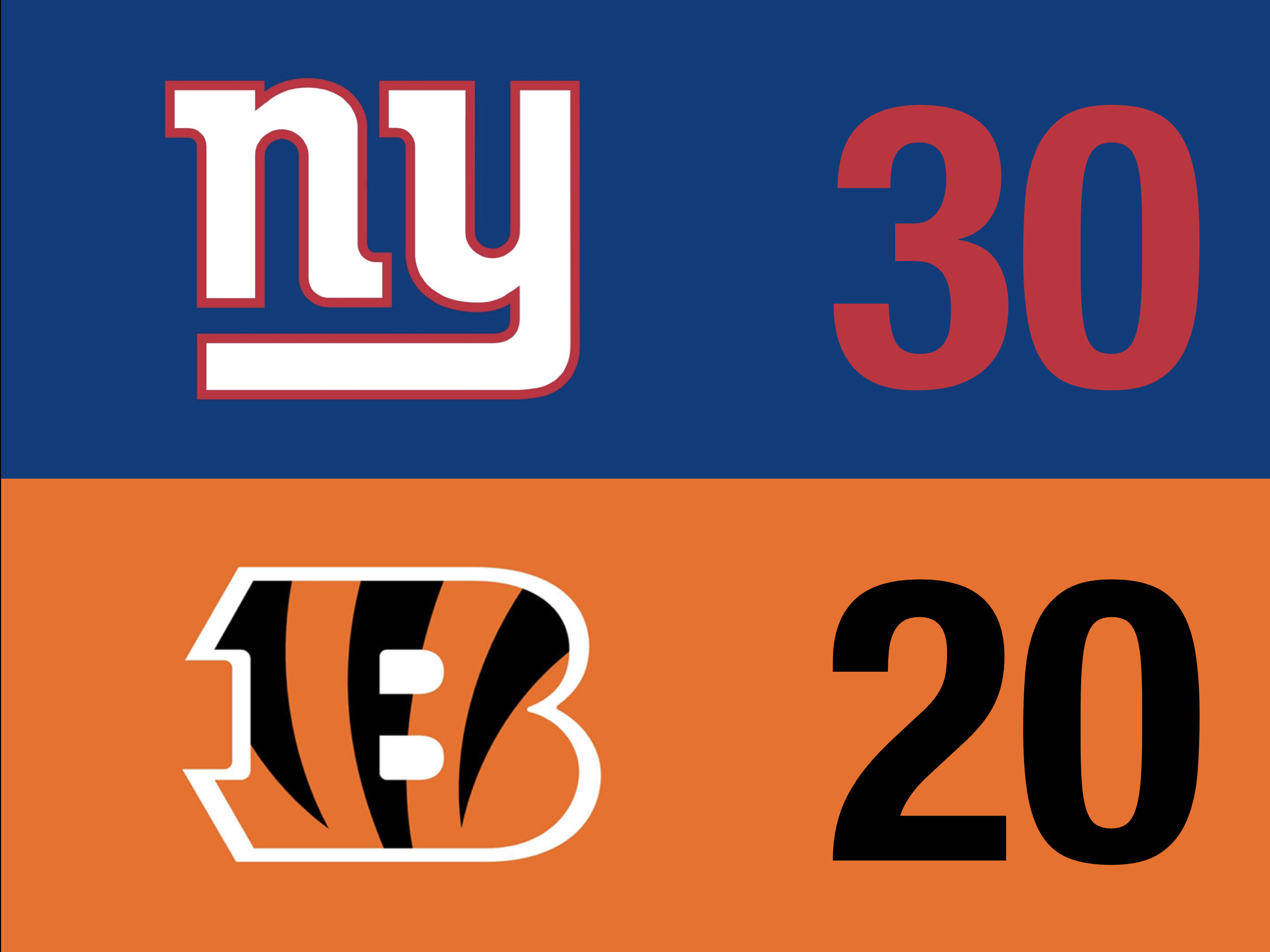 ![]() | With QB Joe Burrow done for the year, it’s a whole new story in Cincinnati. This offense will be without its newfound firepower. This will allow for a Giants victory that believe it or not, will make them tied with Washington for the NFC East lead. The Giants don’t have an amazing offense either, but QB Daniel Jones should be able to outperform Brandon Allen, who will be under center for Cincy. |