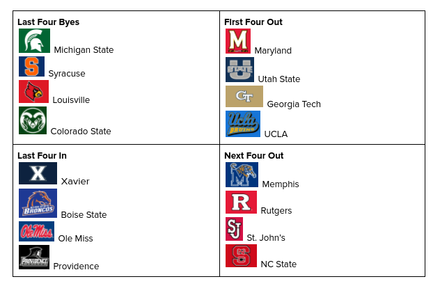 The Terps just barely miss the field of 68. They have a good handful of wins including one over Illinois but they had a rough week, losing to Northwestern and for the second time, Penn State. Utah State is also very close. They were definitely competitive in the Mountain West, but struggled a bit in non-conference games, the worst of which was a loss to South Dakota State. Georgia Tech has crafted a decent tournament resume after significant ACC success, but they are just 13-8 after beginning the season with two losses to mid-major squads: Mercer and Georgia State. UCLA has been alright, but they have not had many opportunities for big wins in the Pac-12, and they have not stood out like Oregon, Colorado, and USC have. UCLA’s biggest win by far is over Colorado, and they’ve dropped games to bottom half Pac-12 teams that are nowhere near tourney material.