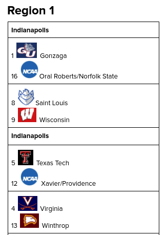 Saint Louis is seen as a bubble team by most but I think their wins over LSU and St. Bonaventure (in the regular season) should secure them a safe spot in the tourney. They did get swept by Dayton and were a little tripped up by the long COVID pause but other than that they posted a strong season. I have them against Wisconsin, a middle of the pack B1G team, in the 8-9 game. Drake may have lost to Loyola-Chicago in the Arch Madness final but I think their undefeated start and competitiveness with a ranked Loyola team warrants a spot in the tourney. I have Western Kentucky here on an autobid; their upset of Alabama is the reasoning behind their high seed. They end up with a higher seed than Big East teams Xavier and Providence, who I have meeting in the First Four. A 22-1 Winthrop squad gets the 13 seed here after punching their ticket, and fellow ticket punchers Morehead State and Oral Roberts have lower seeds. Norfolk State and Siena should come out on top of their conferences as well.