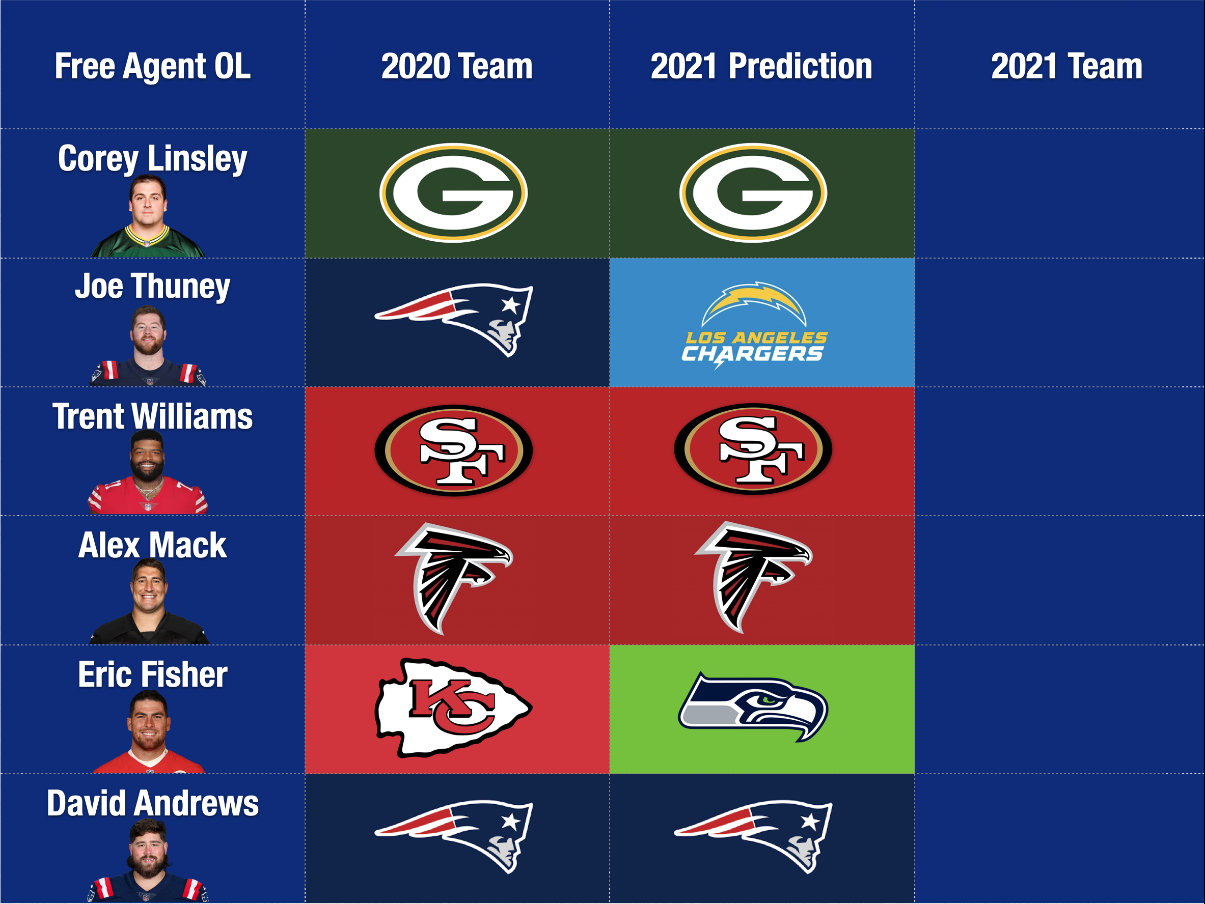 I have a lot of top offensive linemen resigning with their 2020 teams, including Linsley, Williams, Mack, and Andrews. If they resign Andrews, they probably won’t need Thuney as they can run with a starting o-line of Trent Brown, Michael Onwenu, Andrews, Shaq Mason, and Isaiah Wynn. I have Thuney headed to the Chargers, who probably need to sign multiple interior o-linemen this off-season. It will be hard for Fisher, who was released by the Chiefs, to land another left tackle job over guys like Orlando Brown (who will probably be traded to a team in need of a LT). I have him landing in Seattle and playing the right side.