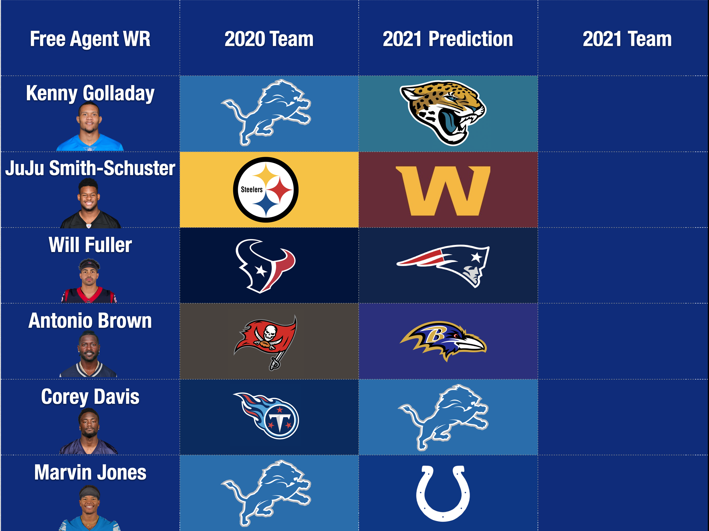 The Patriots are another team that could use a #1 receiver, and I think Fuller fits the bill. He really proved himself in his contract year with the Texans despite a PED suspension cutting his season short. I have AB headed to the Ravens to form a duo with his cousin Marquise. Davis heads to Detroit, as they have limited money but only have 2 WRs on the current roster (I do also expect the Lions to draft 1-2 receivers). The Colts will probably be in the mix for guys like Golladay, but I have them signing a cheaper former Lion in Marvin Jones to play next to Michael Pittman Jr. and Parris Campbell.