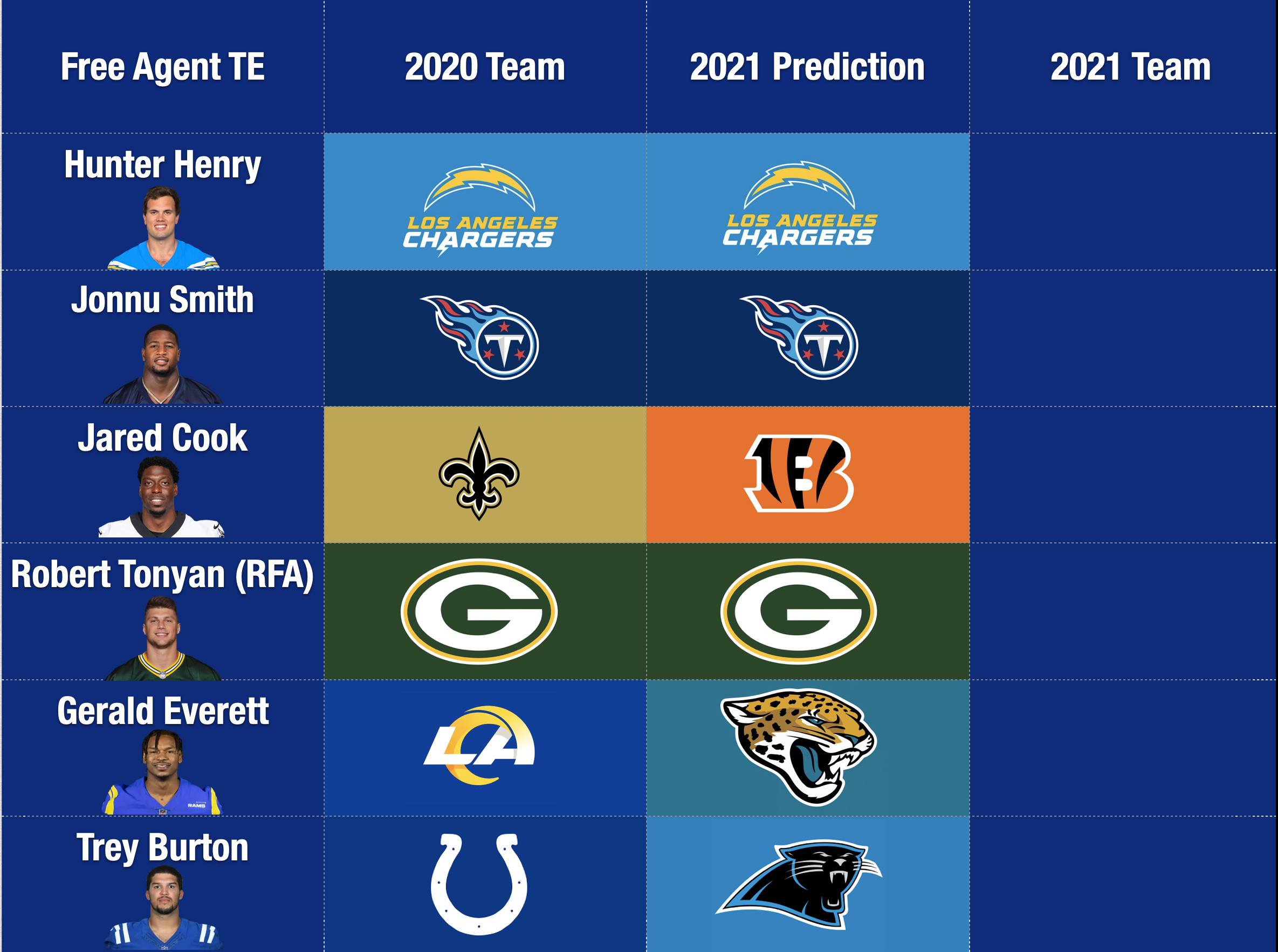 Meanwhile, expect the Chargers and Titans, two other teams with a big tight end need, to resign their 2020 tight ends to new contracts. I also have Tonyan, a restricted free agent, returning to his 2020 team, the Packers. The second tier of tight ends will see more movement in the free agent market. I have Everett leaving his time share with Tyler Higbee for the Jaguars starting TE job. Similarly, I have Burton, who was part of Indianapolis’ TE trio, headed to Carolina. The Panthers could still easily pair Burton with Pitts from the NFL draft. I have Cook, an older tight end, headed to Cincinnati to add depth to young QB Joe Burrow’s offense.