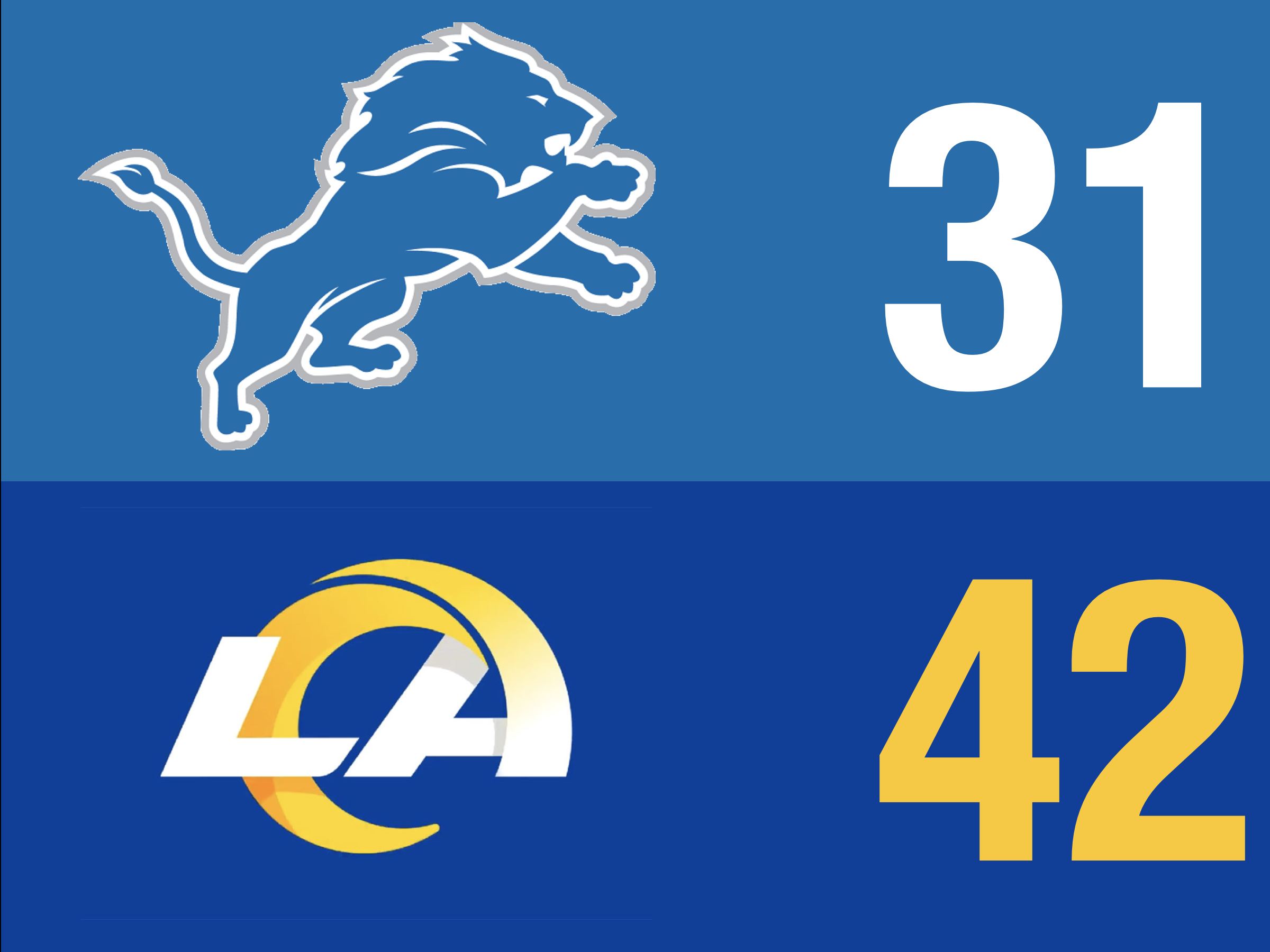 ![]() | Look for QB Jared Goff to rely on TE T.J. Hockenson to stay in this game. Goff is still no match for his former team, now led by QB Matthew Stafford and his former head coach in Sean McVay. I’m expecting an explosive game out of Stafford as he turns to WRs Cooper Kupp and Robert Woods in a high scoring victory. |