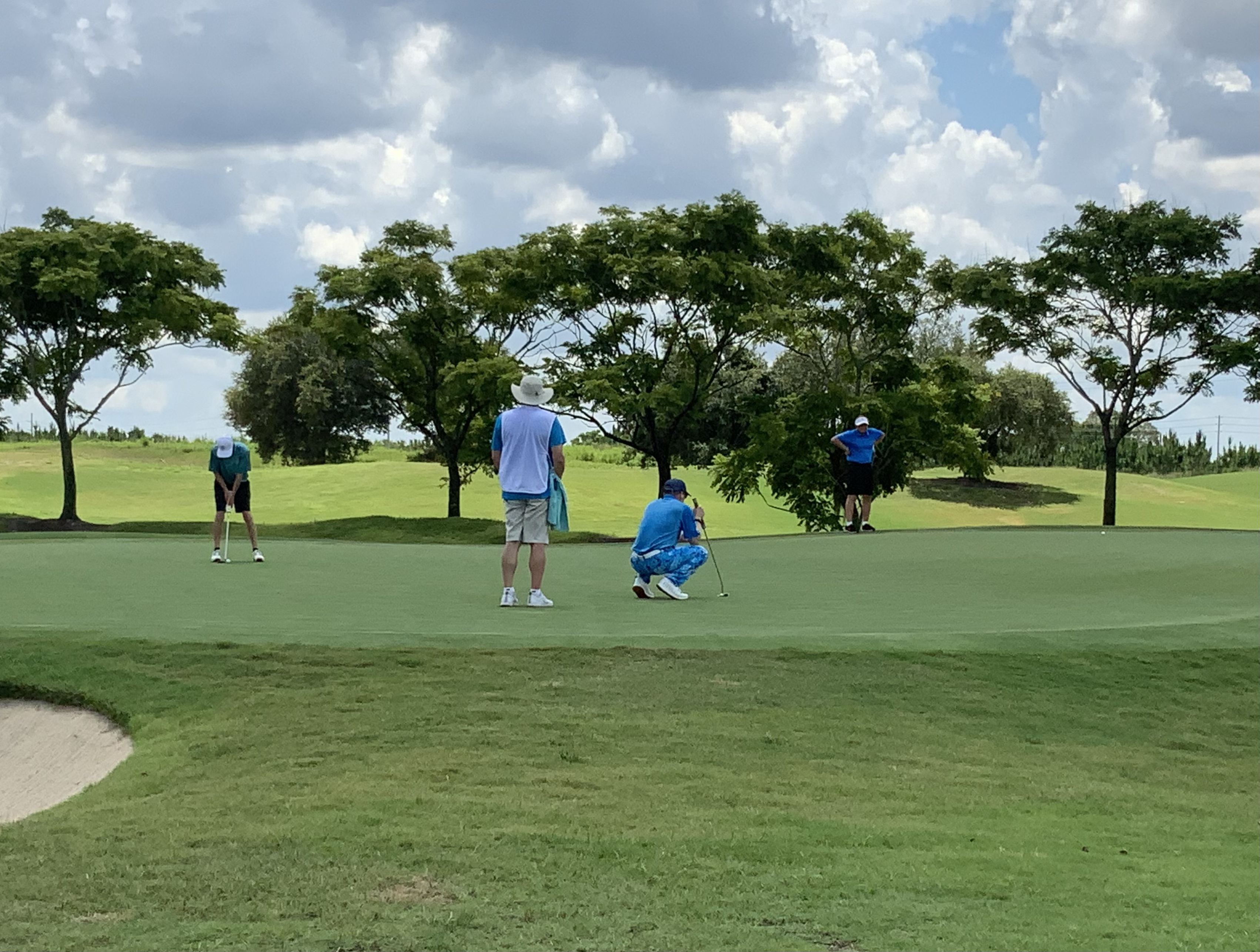 For another funny story, Florida is known for its gators and that proved true here today. Fortunately, the golfers cleared the water trap on the par 3 hole 13 where a baby alligator was spotted along with a young turtle a few feet away.