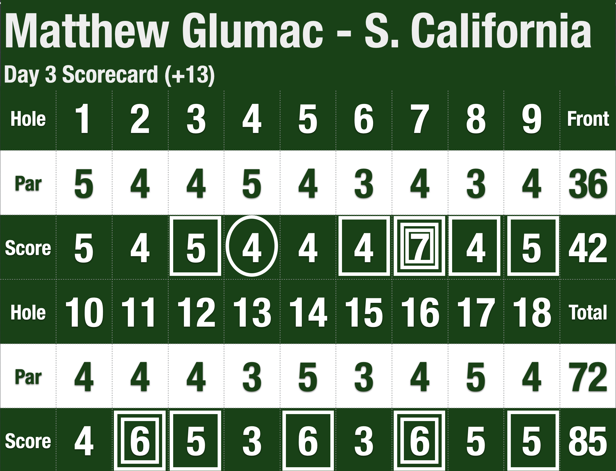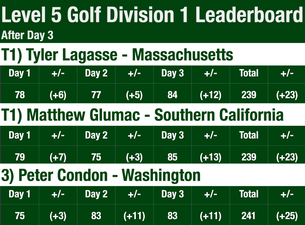 After hole 14, Lagasse, Glumac, and Condon all stood at +10 on the day, meaning Lagasse was still 1 behind Glumac for the tournament just like he was when the day began. For the first time since hole 1, all three golfers had the same score, as they made par on hole 15.
