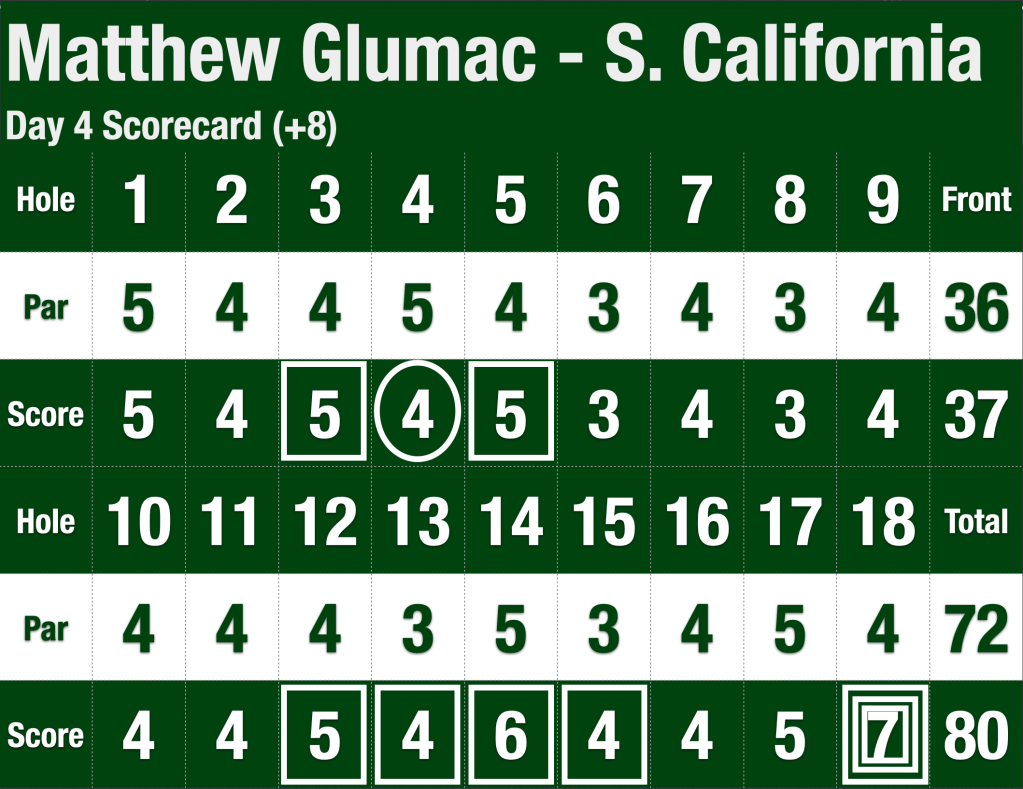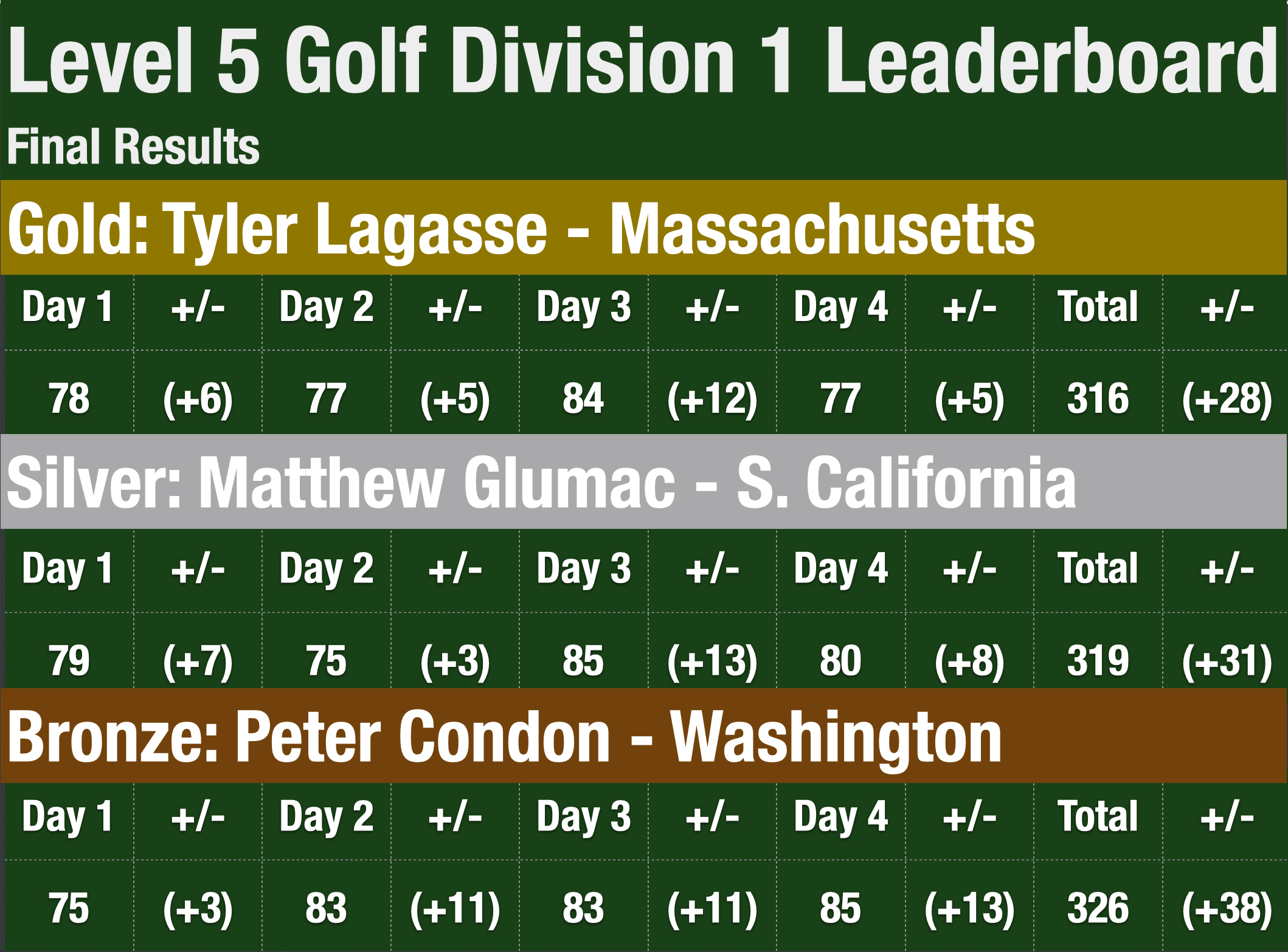 Glumac ended up with a triple bogey to finish the day with an 80 (+8). He finished the tournament three strokes behind Lagasse and won Silver. Condon shot an 85 (+13) to finish the tournament 10 strokes behind Lagasse and win bronze.