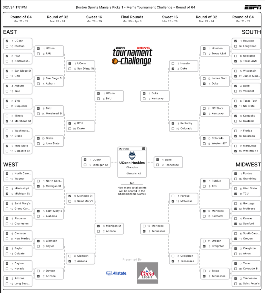 I don’t know many people who had heard of McNeese before this season. However, former LSU coach Will Wade has quietly led this McNeese team to a 30-3 record. This team just gives off the vibe of a Cinderella. After a very limited program history, the Cowboys had one of the best records and best offenses in all of college basketball. While they haven’t exactly gone up against elite teams just yet, they beat VCU, UAB, and Michigan by double digits. It would be quite the story if they went on a run. In addition, I’d like to think they received a pretty good draw. #5 Gonzaga could possibly a challenge in the Round of 64, but the Bulldogs only really have one quality win outside the WCC (Kentucky). If McNeese can pull that one off, the highest seeds they’d potentially face are Kansas (who will be without Kevin McCullar) and Purdue (do I need to say anything else?) In my bracket, this is all creating the perfect storm for a McNeese Elite Eight run.